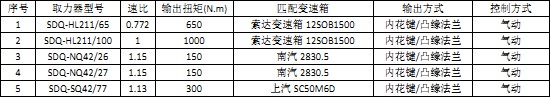 2、取力器型號(hào):SDQ-HL211/100,速比:1,輸出扭矩(N.m):1000,匹配變速箱:索達(dá)變速箱12SOB1500,輸出方式:內(nèi)花鍵/凸緣法蘭,控制方式:氣動(dòng)。