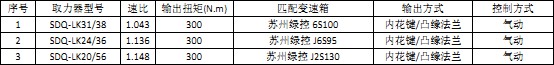 3、取力器型號(hào):SDQ-LK20/56,速比:1.148,輸出扭矩(N.m):300,匹配變速箱:蘇州綠控J2S130,輸出方式:內(nèi)花鍵/凸緣法蘭,控制方式:氣動(dòng)。